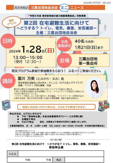 三鷹台団地自治会は、昨年、「食の備え」をテーマに初めて防災勉強会を開催。楽しく防災を学び、住民の交流を深めることができました。参加者・役員ともに好評で、継続的に開催することにしました。