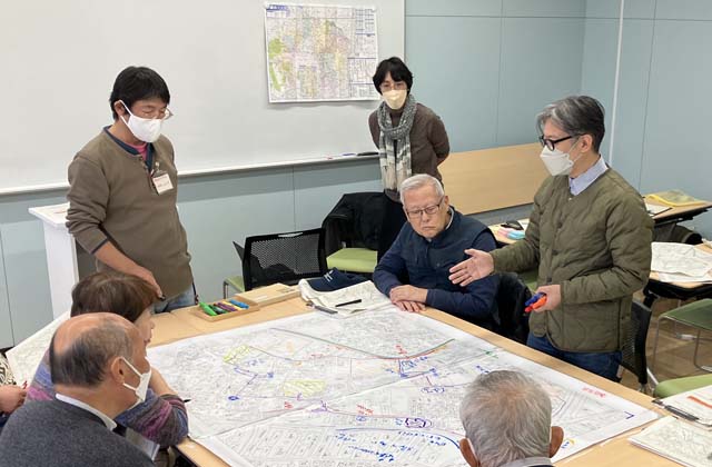 まち歩き当日は、参加者全員で地図を使って順路を確認し、ポイントとなる場所を把握しました。心配な場所や課題と思われる箇所をチェックし専門家の解説を受けながら散歩をしました。