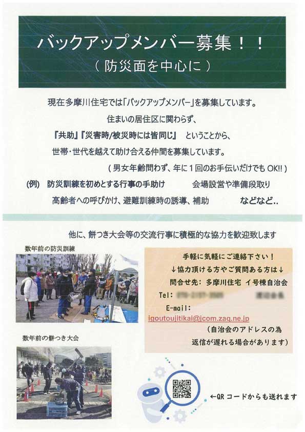 多摩川住宅イ号棟自治会:バックアップメンバー募集チラシ