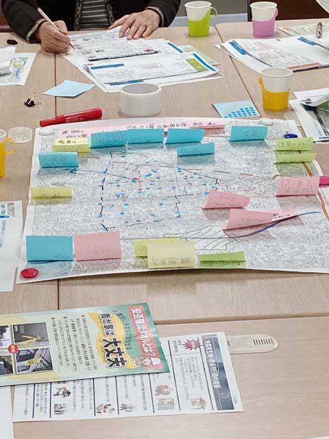 そこで、町会として災害時初動対応マニュアルの作成に向け、防災専門家を招いた意見交換会を開催しました。地震発生から時系列でのタイムラインを考えるワークを行い、町会として実施することや役割分担をまとめると共に、専門家のアドバイスをもとに地図上に地域資源を書き起こしました。