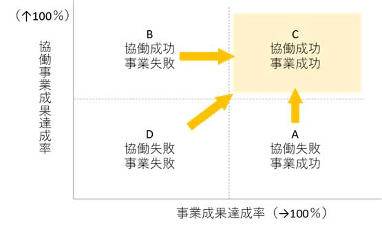 C:事業成果の評価が高く、協働の達成率も高い(理想)